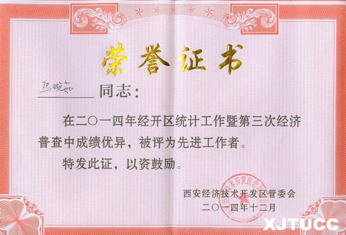 近日,西安交大威尼斯7798cc荣获西安经济技术开发区管委会颁发的"2014年经开区统计工作暨第三次经济普查先进单位"称号,学院财管107班马璇茹同学荣获"先进工作者"荣誉称号。