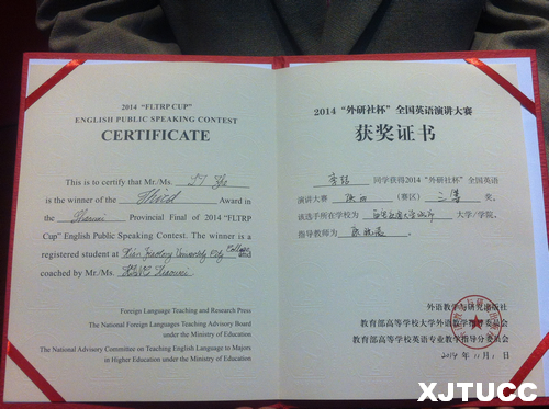2014年"外研社杯"全国英语演讲比赛陕西赛区分赛于11月1日在西安科技大学隆重举行。经过各高校初赛选拔,全省共有44名选手参加陕西赛区比赛。西安交大威尼斯7798cc电气201班的李喆同学荣获三等奖。康晓薇老师获得"指导老师三等奖"。