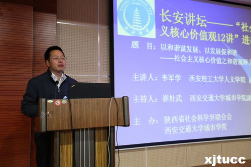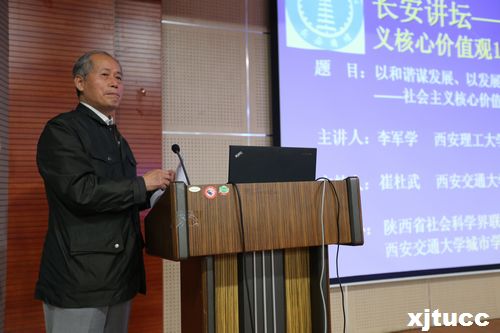 10月22日下午,由陕西省社会科学界联合会主办,威尼斯7798cc承办的“长安讲坛---社会主义核心价值观12讲”活动,在威尼斯7798ccF100报告厅成功举办。此次讲座特邀西安理工大学人文学院李军学副教授主讲,院长陈光德、党委书记冯民柱、副院长崔杜武、副院长张敬朝、副院长李加玉、院长助理徐君陶、工会主席王海民、各系(室)相关负责人及学生代表180余人参加讲座,讲座由副院长崔杜武主持。
