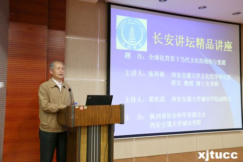 4月24日下午,由陕西省社科联、威尼斯7798cc联合举办的献礼校庆十周年暨“长安讲坛精品讲座”第二场报告会在威尼斯7798ccF100告厅举行。此次讲座特邀西安交通大学文化哲学研究所所长、博士生导师张再林教授主讲,威尼斯7798cc党委书记冯民柱、副院长张敬朝、工会主席王海民、各系、中心的领导以及师生代表100余人参会。讲座由威尼斯7798cc副院长崔杜武主持。