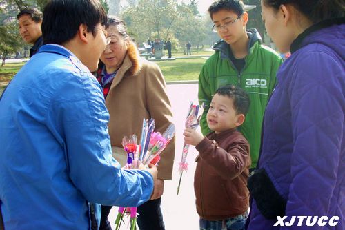 早上九点,两组成员分别到达目的地,拉起横幅,捧出一束束娇嫩的鲜花,向路人介绍活动的目的和意义。人们纷纷停下脚步,用爱心买下一束鲜花,为西安儿童福利院那些可爱的孩子们献上自己的一份爱心。在这其中,也有许多父母陪伴着的孩子,他们在父母的指引下为那些同龄的小朋友送上了一份美好祝愿。