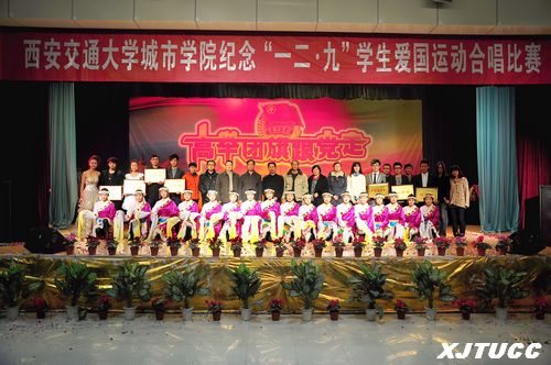 今年是纪念“一二·九”学生爱国运动76周年,全院七个合唱团近700名同学,满怀爱国热情,以嘹亮的歌声唱响时代主旋律,展现了城院青年学子良好的精神风貌。经过激励的角逐,最终管理系合唱团以精心编排的《激情燃烧的岁月》组曲摘得桂冠,荣获一等奖;应用经济系合唱团演唱的《怀旧动画》、《掀起你的盖头来》,外语护理系合唱团的《明天会更好》、《祖国不会忘记》荣获二等奖;计算机系合唱团演唱的《我们走在大路上》、《我和我的祖国》,电信系合唱团的《喀秋莎》、《众人划桨开大船》以相同得分并列三等奖;机械系合唱团的《众人划桨开大船》、《大中国》,艺术系合唱团的《歌唱祖国》、《保卫黄河》分别荣获优秀奖;外语护理系、艺术系分别获得合唱比赛优秀组织奖;管理系万翔同学荣获全场最佳指挥奖。