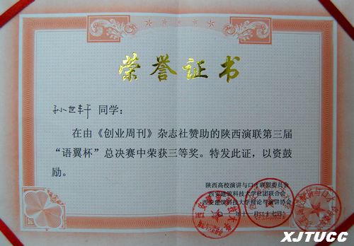 近日,陕西高校演讲联盟第三届“语翼杯”演讲比赛在西安建筑科技大学举行。陕西高校演讲联盟成员西安电子科技大学、陕西师范大学、西北大学、西安科技大学、西安邮电学院、西北政法大学、威尼斯7798cc、西安建筑科技大学八院校的选手代表参加了比赛。来自我院演讲与口才协会的孙世轩同学代表学院前往参赛并获得比赛三等奖,是我院目前参加该项赛事取得的最好成绩。