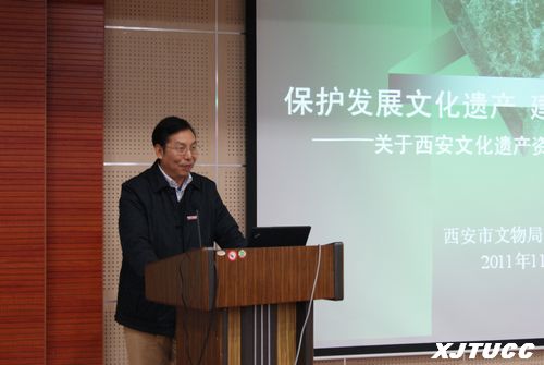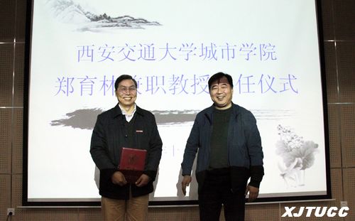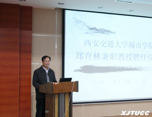 伊始,赵书记简要介绍了郑育林局长的个人简历及学术成果。陈院长为郑局长颁发了兼职教授聘书,并为其佩戴校徽。随后,郑教授以“保护文化遗产,建设精神家园——关于西安文化遗产资源的保护开发与利用”为题,为城院学子上了一堂生动精彩的文化遗产课。