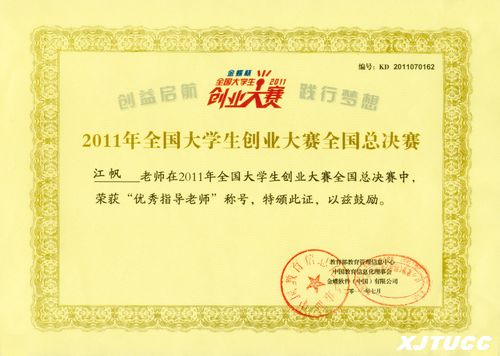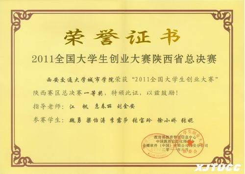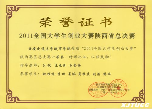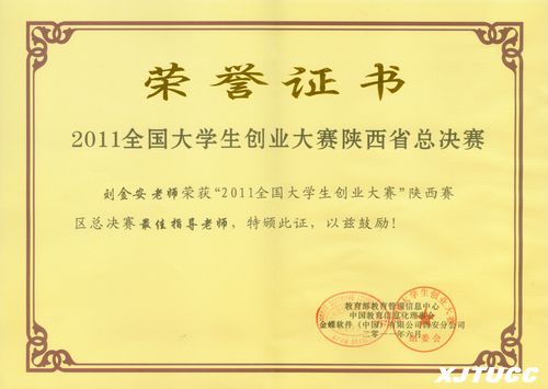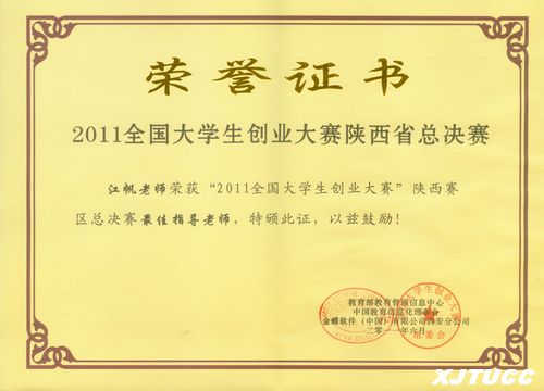 - 2011年6月11日,我院派出两支参赛代表队参加陕西赛区比赛,代表队1队由信管001班魏勇、张宝玲、计算机002班李露莎、财管802班梁怡涛、徐小娇、会计805班张妮组成;代表队2队由金融803班姚植远、李琳、工商801班刘淇、会计805班樊瑶、信管001班夏添、计算机802班龚恒昱组成。在江帆、惠春丽、刘金安老师的指导下两支代表队均荣获2011“金蝶杯”全国大学生创业大赛陕西赛区一等奖。江帆、惠春丽、刘金安老师获 “最佳指导老师”称号;