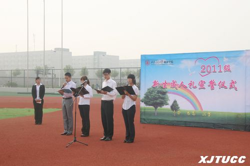 紧接着,新生代表机械系王柏森同学带领全体2011级同学进行庄严的成人宣誓。面对鲜艳的五星红旗,新生同学们满怀激情,铿锵有力地呐喊出成人誓词,以孝心对父母,以热心对社会,以忠心对国家,立志成为有理想、有道德、有文化、有纪律的社会主义公民。