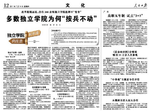 编者按:2011年7月14日,《人民日报》文化版(12版)以“改革期限逼近,仍有300余所独立学院选择不‘变身’——多数独立学院为何‘按兵不动’(独立学院向左走向右走)”为题报道了陈光德院长谈独立学院发展问题。截至目前,人民网、凤凰网、新华网、中国教育和科研计算机网等数十家全国及地方主流媒体进行了转载。