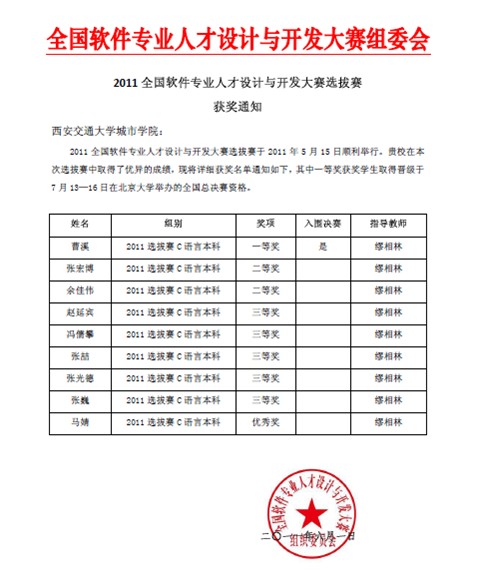代表西安交大威尼斯7798cc参赛的计算机系11名学生认真复习,积极参赛,在本次大赛的陕西赛区取得了优异的成绩,其中计算机801班曹溪同学获得一等奖,计算机901张宏博、计算机803班余佳伟同学获二等奖,计算机701班赵延宾及张光德、计算机802班冯儒攀、计算机901班张喆、计算机801班张巍同学获得三等奖,计算机902班马婧同学获优秀奖。