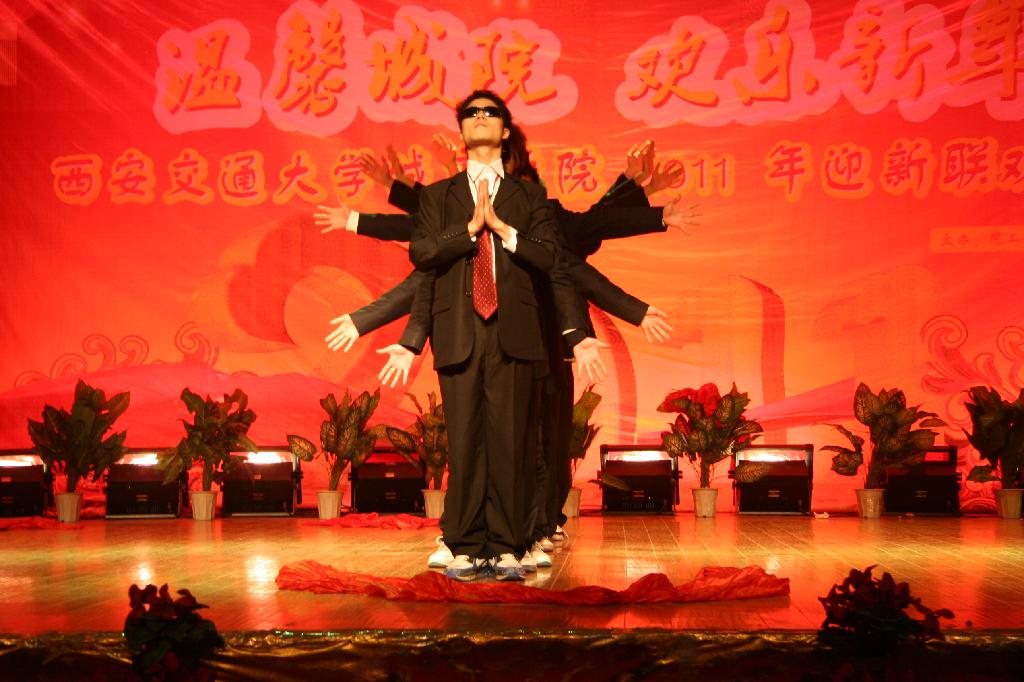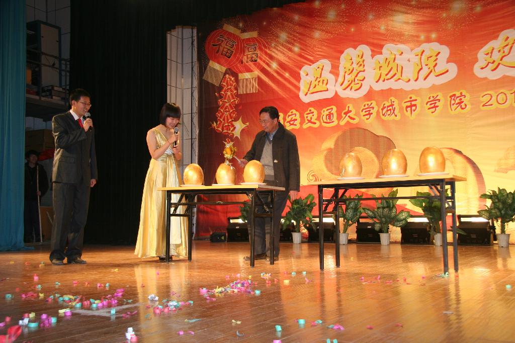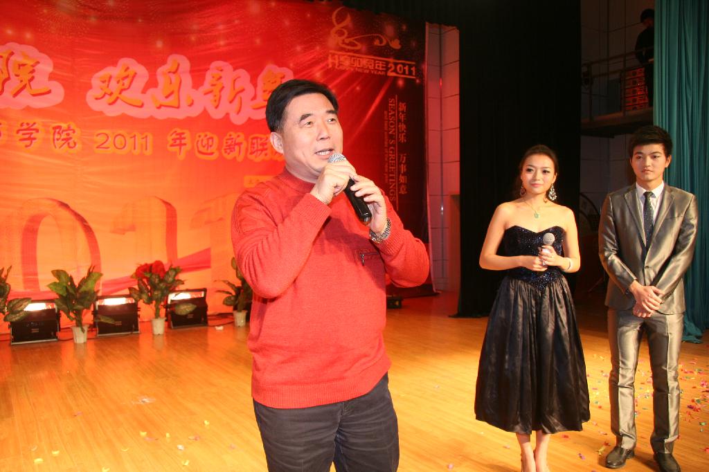 师生联欢会开场以一段学生自编自导的《新年雷人秀》舞蹈展示了当代大学生的朝气。接着,院长陈光徳教授为本次新年联欢会致辞,他回顾了学院在2010年走过的风风雨雨,指出在过去的一年中学院工作捷报频传、硕果累累,各项工作呈现出良好的发展势头。他希望全体师生携手起来,抓住机遇,迎接挑战,奋发图强。并在佳节来临之际为广大师生员工送上了最真挚的祝福。联欢晚会精彩不断,高潮迭起,无论是歌舞表演,还是小品T台秀,无不彰显出师生的才华。特别是由我院王爱新老师带来的《贵妃醉酒》京剧选段表演,在教师民乐团的伴奏下,给人以耳目一新的视觉、听觉享受。同时,联欢会还设置了幸运大抽奖、抢歌、砸金蛋、小丑献礼等互动游戏,大大增强了现场观众的互动性。