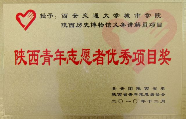 近期,由共青团陕西省委、陕西省青年志愿者协会组织的评优中,西安交大威尼斯7798cc陕西历史博物馆义务讲解项目荣获“陕西省青年志愿者优秀项目”,院青年志愿者协会候婧同学荣获“陕西青年志愿者优秀个人”称号。