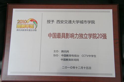 2010年12月15日,2010“回响中国”腾讯网教育年度中国总评盛典在北京香格里拉酒店隆重举行。该活动由腾讯网主办,中国教育电视台、CCTV中学生频道、中国教育新闻网联合协办。西安交大威尼斯7798cc凭借优异的教学质量,良好的社会口碑,不凡的发展成果,继2009年之后再次荣获中国最具影响力独立学院20强称号。