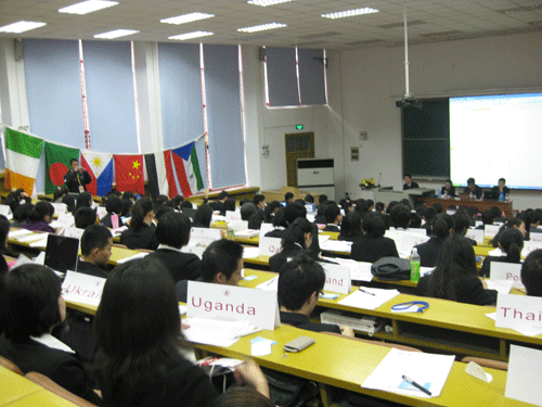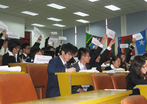 模拟联合国大会是一项国际性大学生活动,大会全真地模拟真实联合国大会的形式,全部用英文进行交流。“各国代表”不仅要在指定时间内用正规外交辞令表达本国对此议题的基本立场,还需充分发挥“外交技巧”,与友好国家结盟,与异己国家谈判,最终达成协议,并写出决议草案提交大会,若表决通过,则生成最终解决方案。此项活动为大学生了解国际环境和中国外交提供了学习机会,对于提升大学生的英语应用能力、分析决策能力、交流沟通能力及培养良好的团队合作意识发挥了积极的作用。