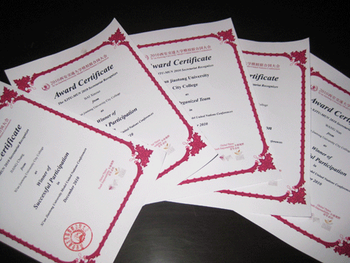 模拟大会围绕全球“儿童权益保护”和“不正当军事和轻武器交易”两个世界问题展开讨论。西安交大威尼斯7798cc同学在会前查阅大量资料,进行认真准备,其中演讲与口才协会的李盼、王楠两位同学代表非洲吉布提共和国参加人权委员会,与其他代表围绕“儿童受教育的权利”这一主题展开讨论;疯狂英语社的姜畅、柏欣佐同学代表乌干达共和国出席安全理事会就“不正当军事和轻武器交易”进行激烈辩论。威尼斯7798cc代表队的出色表现受到评委的一致好评,最终拿下最佳团队奖,成为获此殊荣的三所高校之一(另两所为北京第二外国语学院和西北工业大学),李盼、王楠、姜维、柏欣佐四位同学分别荣获个人优胜奖。