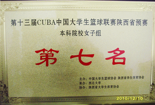 本届比赛由中国大学生篮球协会主办、西北大学承办,比赛于11月26日至12月5日进行。共有西北农林科技大学、西安财经学院、西安建筑科技大学、西安理工大学等48所高等院校参加,此次比赛分两个阶段,第一阶段采取用分组循环,第二阶段采用交叉赛决出名次。我院在主力队员受伤的情况下,仍然顽强拼搏,经过7场激烈角逐,最终获得第七名的好成绩。
