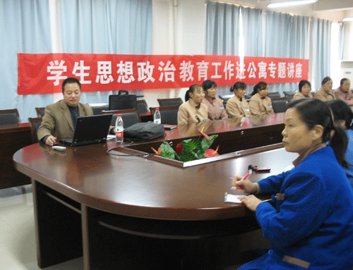 王玉峰老师从自身多年的学生政治思想教育管理经验出发,指出公寓老师跟学生交流的机会比较多,因此学生公寓老师的思想教育工作显得尤其重要。他强调公寓老师对学生在学习生活和社会交往中遇到的思想、心理及人际关系问题可以随时随地进行思想教育和引导,从而为学生顺利完成大学阶段的学业发挥应有的积极作用。讲座中,王老师还结合实际着重分析了学生公寓老师在学生思想工作中的主要对策及方法,以及经常性思想工作的沟通技巧等内容。