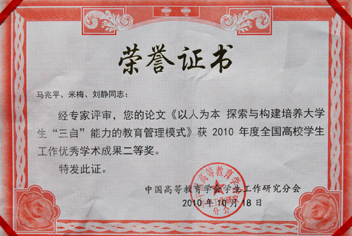 从刚刚结束的中国高等教育学会学生工作研究分会主办的“2010年全国高校学生工作年会”上传来喜讯,西安交大威尼斯7798cc提交的由马兆平、米梅、刘静三位老师撰写的《以人为本 探索与构建培养大学生“三自”能力的教育管理模式》论文荣获2010年度全国高校学生工作优秀学术成果二等奖。