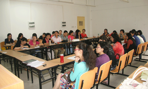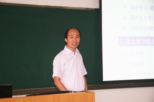 韩红建老师首先介绍了新加入我系的各位兼职教师,并对他们的到来表示热烈欢迎。随后,他向全体与会教师作了“外语系及《大学英语》课程教学简介”的专题报告。报告结合我院应用型人才培养的目标、学生英语学习现状,就我院大学英语课程在课堂教学、学生课外英语自主学习管理以及课程教学管理等方面的情况进行了详尽的阐述。该专题报告还涉及到我院《大学英语》课程的设置、《大学英语》课程教学理念、所倡导的课堂教学模式、教学质量动态监控体系、大学英语课程的教师团队建设举措,以及为活跃我院英语学习氛围、提高大面积英语教学质量,所开展的一系列英语第二课堂活动。