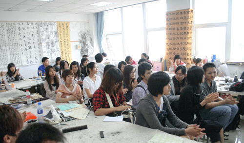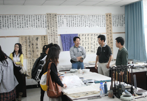 来宾首先在系相关教师的陪同下参观了我院艺术设计系的各个专业教室和实验室。然后,和艺术系书法801班和同学们一起聆听了我系书法老师授课,并进行了友好的互动交流。