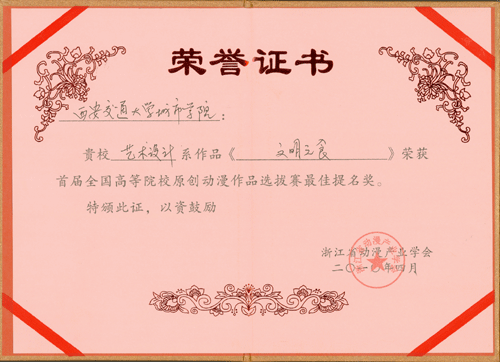 为响应第六届中国杭州国际动漫节,浙江省动漫产业学会举办了首届全国高等院校原创动漫作品选拔赛,全国各高校学生纷纷参赛,而我院艺术设计系也组织动漫专业的学生积极参与了此次活动。