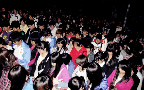 4月26日晚,院学生艺术团在宿舍楼下倡导全院学生,组织开展了以“玉树不哭,点亮手机”为主题的集体默哀祈福活动。晚上9时,全校所有宿舍楼内熄灯,学生在宿舍外聚集,在艺术团的带领下,大家先集体默哀了一分钟,然后共同点亮手机喊着“青海坚持,玉树不哭”的口号,为所有玉树人民祈福加油。整个活动持续近20分钟左右。