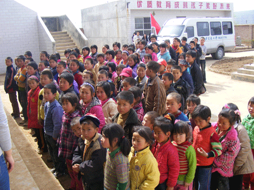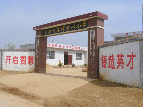 上安村源博爱心小学距离蓝田县城30多公里,目前有100多名学生,6个班级,5名教师,除校长外,其他四位都是代课教师。因为这些深处大山里的孩子没条件进幼儿园和学前班,所以他们的学前教育都是在这所学校里接受。这所小学是西安市海拔最高的小学,也是附近百里山区唯一的小学,它深处大山顶峰,最远的孩子到学校有5公里路程,而大部分的孩子中午赶不上回家,就饿着肚子上课。而且学校资源有限,条件相当艰苦,很多桌椅都相当破烂,设施也比较陈旧。