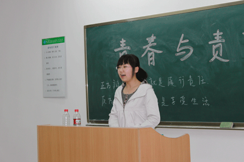 4月5日晚,我院外语系904、905班共同组织开展了“青春与责任同行”主题辩论赛,旨在提高同学们对青春、责任的深刻认识,使大家明白青春、责任的真谛――不断探索学习和勇于承担责任的态度。活动邀请了应用经济系辅导员王飞老师、电信系辅导员辛红伟老师、艺术系辅导员李成老师及外语系辅导员马瑞老师和吴昊翔老师参加,城院辩协成员担任辩论赛的主席和评委。