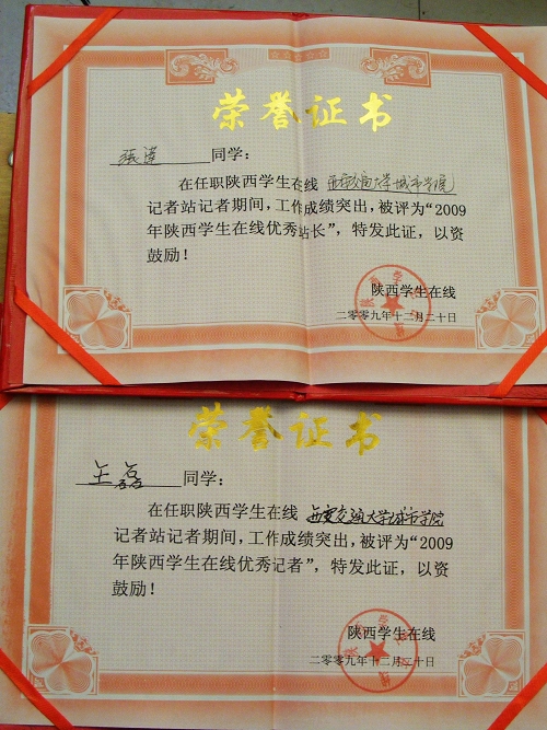 12月20日下午,陕西学生在线2009年度工作表彰大会隆重举行。陕西学生在线运营总监王增祥老师和副总监赵万萍老师向来自陕西各高校记者站的受表彰同学颁发了荣誉证书。其中,我院学生通讯社的张莲同学荣获09年度“优秀记者站站长”称号,王磊同学荣获09年度“优秀记者”称号。
