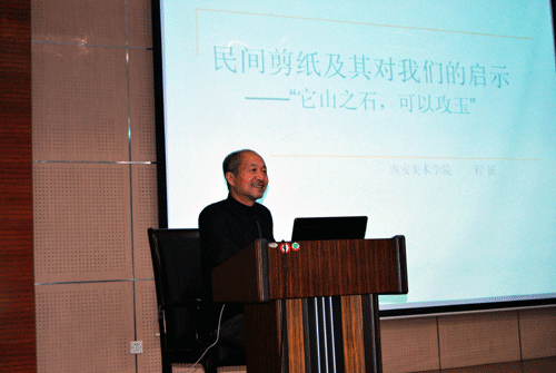 程征教授的专题讲座从“当代美术工作者为什么要学一些民间美术知识?”这一问题入手,通过图文重点讲述了剪纸历史的溯源、剪纸艺术家和剪纸的形式语言特征等几个方面。此次讲座不仅加深了我院同学对民间美术的深刻认识,更使同学们了解了在专业学习中民族文化和艺术精神的重要指导作用。其间程教授旁征博引,语言犀利又不失幽默,博得同学们的阵阵掌声。