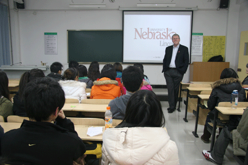 下午4点,Wilson教授、Strattman教授、中美办外教Mariah,Jean在轻松活泼的氛围中,为我院对赴美项目感兴趣的同学做了关于美国内布拉斯加林肯大学的情况介绍。通过反映林肯大学校园文化及对中国留学生采访的视频,让大家更直观的了解林肯大学。最后,其中一位参与项目而目前回国度假的学生向在座师生讲述了自身的经历感受。