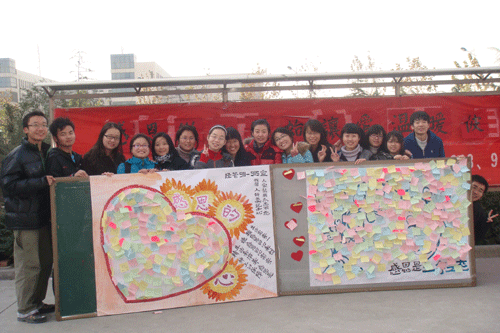 在这次活动中,同学们不仅在五个班内开展了一系列活动来激发同学们的感恩情怀,并且于12月2日至12月4日之间在学院内进行了感恩教育的宣传活动,邀请全院同学在宣传板上留下自己对父母的感恩之言。同时,学院各系部分老师也应邀加入到我们的感恩教育活动中来。