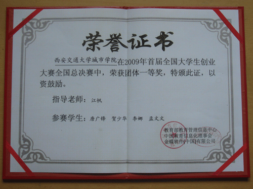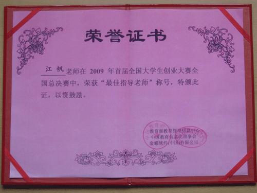 2009年8月3日获全国总决赛一等奖。刘金安老师、江帆老师出席“全国高校创业创新人才研讨会”并赴香港大学进行参观访问。