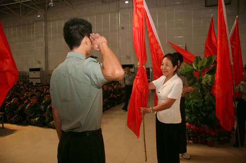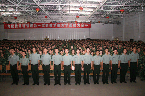 大会在雄壮的国歌声中拉开帷幕,学生服务中心主任马兆平老师代表学院宣布了军训团成立及营以上干部名单。随后,学院党委副书记、副院长韩超老师向军训团授旗,全场掌声热烈。穿上迷彩服的08级学生,精神抖擞,意气风发,昂首挺胸,俨然已是军人模样,铿锵有力的入伍宣誓,表明了他们作为当代大学生为祖国、为人民尽义务的决心。