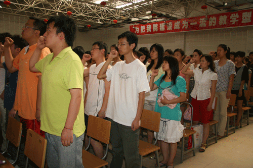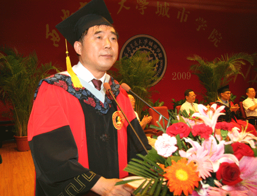 在学院工会主席、管理系主任王海民教授的带领下,毕业生集体进行宣誓,大家各个声音洪亮,场面庄严而隆重。随后学院党委书记、院长陈光德教授走向主席台,发表了精彩感言。讲话中他对学院优秀的学子寄予厚望,对他们提出了殷殷期望,希望他们尽可能快地了解社会、适应社会,成为对社会有用的杰出人才,并深切地祝福他们以及所有城院学子:希望大家时刻心系母校,关心、支持母校的发展,用自己的行动和业绩为母校增光添彩,母校期盼着每位学子事业有成、一帆风顺!