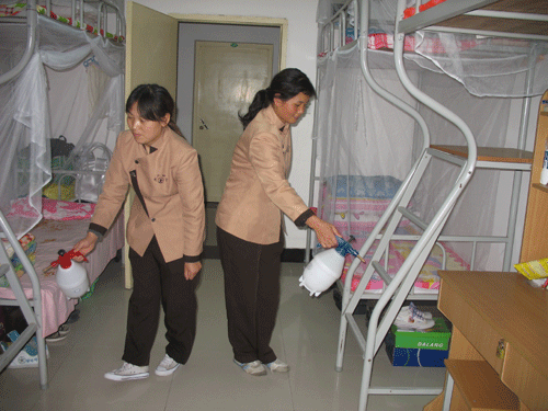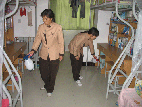 为做好公共环境卫生治理,学院号召同学认真保持宿舍卫生,做到室内不堆放垃圾,剩余瓜果废物及时清理,并指定专人督促检查;组织人员对宿舍楼公共卫生间、走廊、楼梯、门厅、垃圾桶等公共部位进行喷洒消灭消毒剂工作; 5月13日至5月14日学生宿舍管理办公室组织了22人的消毒队,对学生宿舍楼1520间学生宿舍进行彻底消毒。