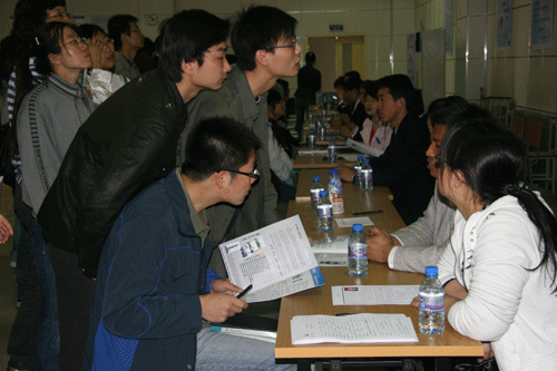 4月10日,学院在学生活动中心隆重举行2009届毕业生第三次校园招聘会,我院及其他兄弟院校3000余人参加了招聘会。院党委书记、常务副院长陈光德教授,院党委副书记、副院长韩超副研究员、副院长李能贵教授以及学院有关部门与系的领导出席了招聘会。