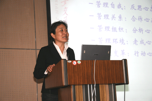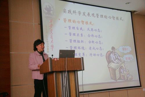 赵西萍教授从四个方面进行阐述:一是坚持科学发展观的理念,二是遵循客观发展规律以人为本,三是统一组织效用构建共赢平台,四是健全与发展观相适应的激励机制。其中,赵教授将什么是科学、科学的特点、如何实践科学发展、什么是激励机制等问题做了全方位的介绍,让大家对学习实践科学发展观的基本概念有了更深的理解,同时,赵教授还突出从人的需要、动机、行为――个体行为的基本模式,综合激励模型、健全激励机制的重要性等向大家做了深入浅出的论述。赵教授将理论分析与实例兼顾,尽显大师风范,会场每个人都认真记录,仔细聆听,受益匪浅。