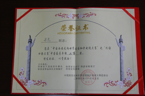 此次外语口语大赛是“中国・西安走向世界出国知识电视大赛”的系列赛之一,由陕西省人民政府外事办、陕西省旅游局等单位联袂主办,陕西省社会科学院长安文化研究中心,中国・西安走向世界出国知识电视大赛组委会承办,西安电视台协办,陕西四十二所高校共两千余名大学生参加了比赛。我院共有6名学生报名参加了海选、初赛、复赛等多个环节,最终马兰、种莹、吴林姣三名同学以扎实的英语口语功底及稳定的发挥力压群雄,闯入最后四十二人的总决赛,并一举取得一个三等奖、两个优胜奖的好成绩。