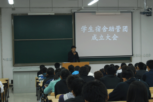 2008年10月27日晚上七点,学生服务中心在教学楼D100教室召开学生宿舍助管团成立大会,学生服务中心马兆平主任、学生教育办公室老师和部分辅导员参加了大会。