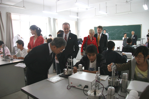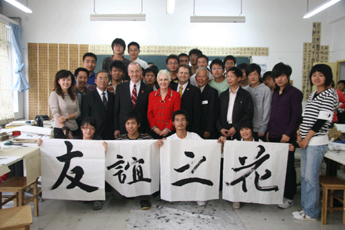 下午2点30分,美国代表团一行首先来到行政楼贵宾接待室与我院领导进行座谈。会上,我院常务副院长陈光德教授首先向来宾介绍了学院概况;林肯大学校长帕尔曼博士、副校长葛朵博士则就中美合作办学项目的实施工作与我院进行了亲切友好的会谈,表示一定要大力做好计划内项目的推进工作,力争使中美合作办学项目取得更大进展,并欢迎学院更多学生及家长能利用这一契机到林肯大学参观学习。与此同时,学院还与来宾互赠礼品,我院艺术系名誉主任钟明善教授、副主任解安宁老师为其送上自己创作的极具中国特色的中国字画。随后,在院领导及部分系主任的陪同下,美国代表团参观了物理实验室、电工电子实验室,并来到艺术教研室现场观摩艺术(书法)课,热情好客的同学们在现场一一为美国贵宾送上自己的作品。尔后,美国代表团来到学院操场,现场感受了正在进行的武术课,他们甚至也摩拳擦掌、跃跃欲试,对我院武术老师的表演赞叹不已。