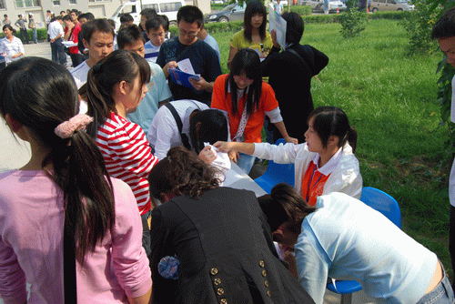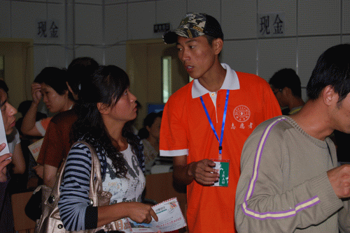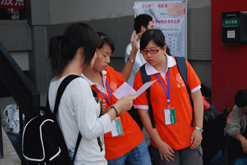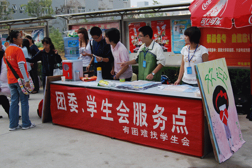 上午8点左右,新生们就在家长的陪同下陆陆续续的地拉着行李从校门口走进学校,志愿者们立即迎上前去帮忙搬运行李,递上凉茶和开水,并引导新生到注册报到现场和熟悉校园环境,为广大新生提供便利,使大家感受到家一般的温暖。由于新生刚刚踏入大学的校园,对各种情况还很陌生,再加上需要办理的手续比较繁琐,“团委、学生会”服务咨询处的迎新志愿者的工作任务十分繁重,但每个志愿者都细致、认真地工作,全身心地投入进去。面对新生的涉及各个方面的问题,他们详细地加以回答,确保每一位师弟师妹都能明确各流程的要求,在最短的时间内完成入学注册手续的办理以及找到相对应的宿舍楼。上午10点左右,处于报到高峰期,报到人数较多,各个点的志愿者们连续工作,忙碌起来连水都顾不上喝,家长们看了深受感动,都尽力配合,虽然帮不上什么忙,但他们的支持、慰问给每一位志愿者以精神上莫大的鼓舞。