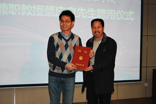 11月25日晚,我院艺术设计系在F100举行了台北震旦艺术博物馆馆长、北京大学教授、博士生导师蔡庆良先生兼职教授聘任仪式,艺术设计系副主任解安宁教授为蔡先生颁发聘书。