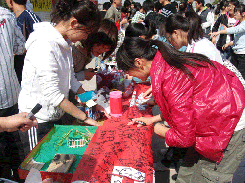 10月16日,09级团总支精选41件具有艺术性、实用性的优秀作品进行展出,其中包括中国地图、城院模型、艺术画、垃圾箱、储物盒、象棋等。在活动现场,许多同学和老师观看环保作品,并在“支持环保”的横幅上签名。