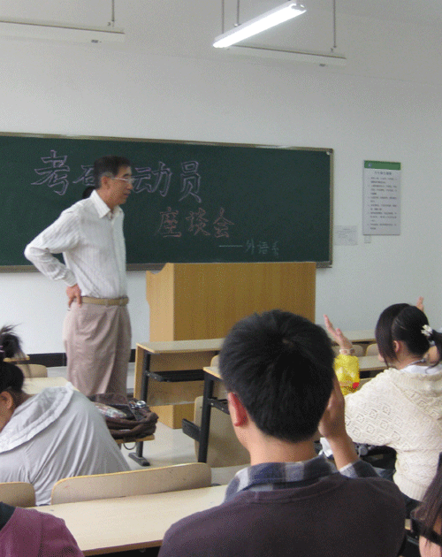 9月16日下午,外语系主任白永权教授在教学楼B316教室为该系准备考研的同学举行了一场精彩的辅导动员座谈会。参加座谈会的有英语专业任课老师赵永生、李欣、胡婷、外语系辅导员马蕊以及06级和07级英语专业准备报考研究生的同学。