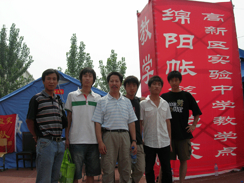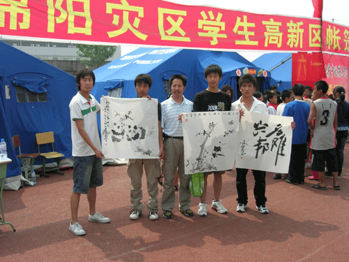 我院艺术系解安宁老师、经管613班陈永辉、电信601班魏代昊、经管713班马海泉、经管721班杨青松4名学生及车队周瑞老师此次奔赴绵阳市自愿担任起志愿者的角色,为受灾群众送物资、献爱心。学院艺术系解安宁老师现场为灾区群众挥毫泼墨,用艺术手法表达出他对灾区同胞的深厚祝福;我院4名学生志愿者在六一国际儿童节这天还与灾区的小朋友们一同游戏,并对他们进行了心理辅导。