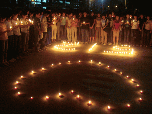5月20日晚9时30分,我院百草园文学社在学生活动中心楼前举行了“祈福中国,悼念亡灵”活动,300余名师生手里捧着蜡烛,系着黄丝带,共同悼念在汶川大地震中失去生命的同胞。