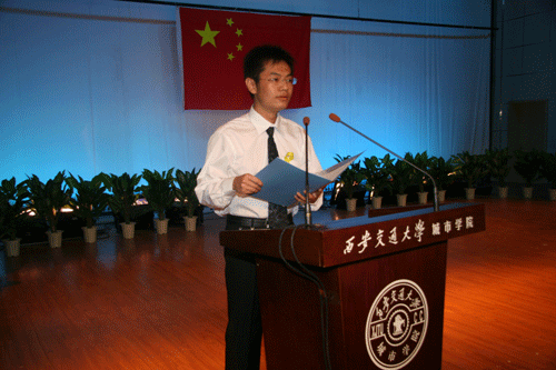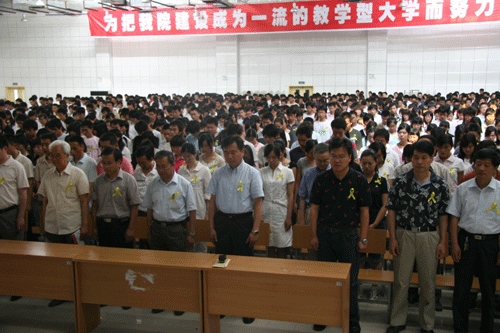 为响应《国务院公告》的号召,表达全院师生对地震灾区遇难同胞的哀悼,学院在学生活动中心举行“向四川汶川大地震遇难同胞下半旗志哀暨爱心捐款”活动。活动由党委副书记、副院长韩超副研究员主持,党委书记、常务副院长陈光德教授作重要讲话。学生代表程伟同学发表赈灾感言。