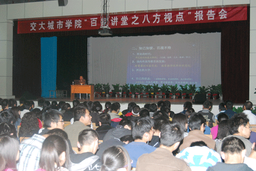 2008年4月22日晚七点,原西安交通大学党委副书记、副校长于德弘教授来到我院“百家讲堂之八方视点”报告会现场,为我院学生做了以“严格要求 奋发图强 全面发展 立志成才”的专题讲座,院党委书记、常务副院长陈光德教授,学生服务中心主任马兆平老师、副主任张学堂老师参加了报告会,报告会由我院党委副书记、副院长韩超副研究员主持。