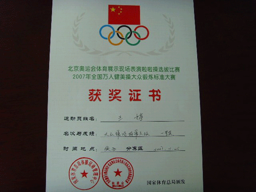 2007年11月24日,我院健美操队参加了在西安体育学院举办的全国万人大众锻炼标准大赛(陕西赛区)健美操比赛,分别获得团体一等奖和团体二等奖。