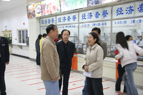 2007年10月9日下午,以陕西省教育厅发展规划处副处长叶军为组长的陕西高校学生食堂检查组深入我院学生食堂检查指导工作,我院陈光德常务副院长、韩超副书记在陪同检查中向教育厅工作组简要汇报了我院学生食堂工作的基本情况。教育厅工作组在详细察看和询问了食堂卫生、饭菜质量及价格之后,对我院学生食堂的工作给予了充分肯定,并对饮食卫生及饭菜质量提出了新的更高的要求。