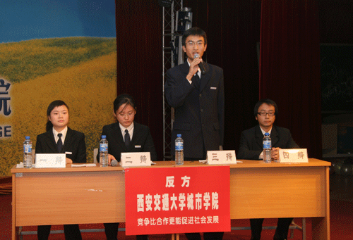 此次辩论赛的辩题为“竞争与合作,哪个更能促进社会发展”。我院作为反方代表队所持观点是:竞争比合作更能促进社会发展;正方西北大学代表队观点是:合作比竞争更能促进社会发展。整场辩论赛高潮不断,尤其在自由辩论环节,双方辩手口齿伶俐、反应敏捷、激情澎湃。这不仅仅是场上的争锋,更是心理素质的较量及友谊的升华。